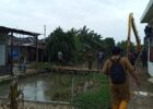 TINJAUAN : Sekretaris Daerah Kabupaten Bekasi Endin Samsudin didampingi Kalak BPBD Kabupaten Bekasi Muchlis serta Kepala Dinas SDA-BMBK Henri Lincol meninjau lokasi banjir di Kampung Setia Mekar, Desa