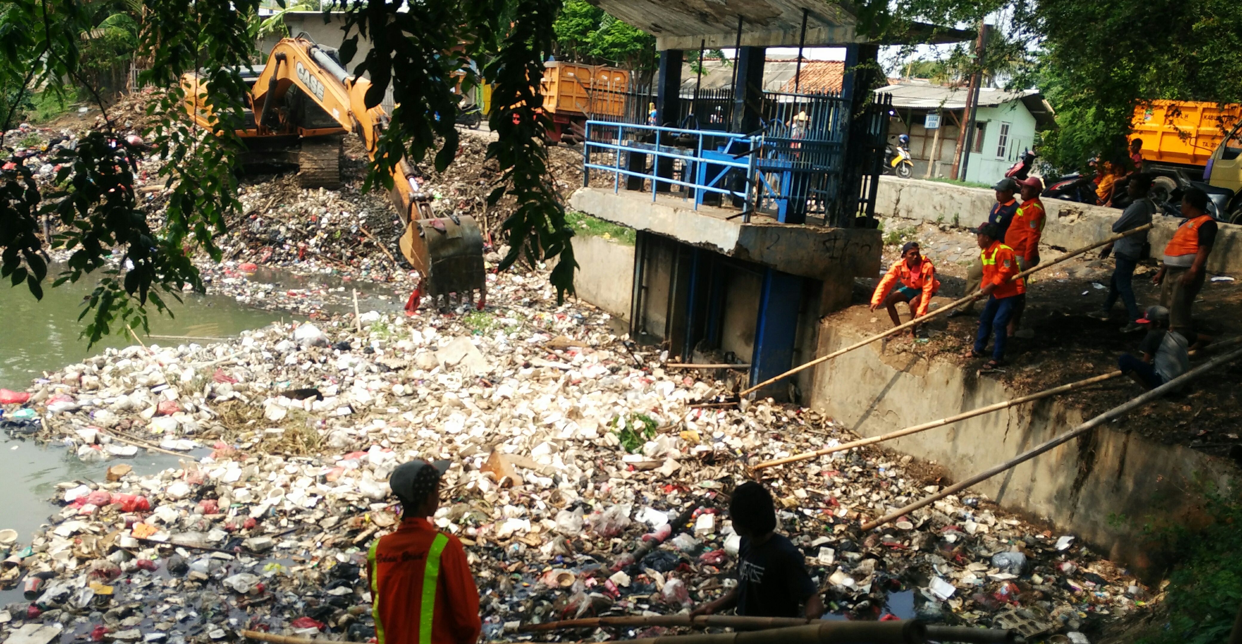 “Ya kita turunkan puluhan pasukan orange dan 7 armada pengangkut sampah dan alat berat eksavator untuk membersihkan tumpukan sampah di sekitar pintu air Kali CBL ini,” terang Husein, Koordinator Lapangan (Korlap) UPTD Pengelolaan Persampahan Wilayah IV DLH Kabupaten Bekasi yang ditemui di lokasi, Senin (9/12/19)