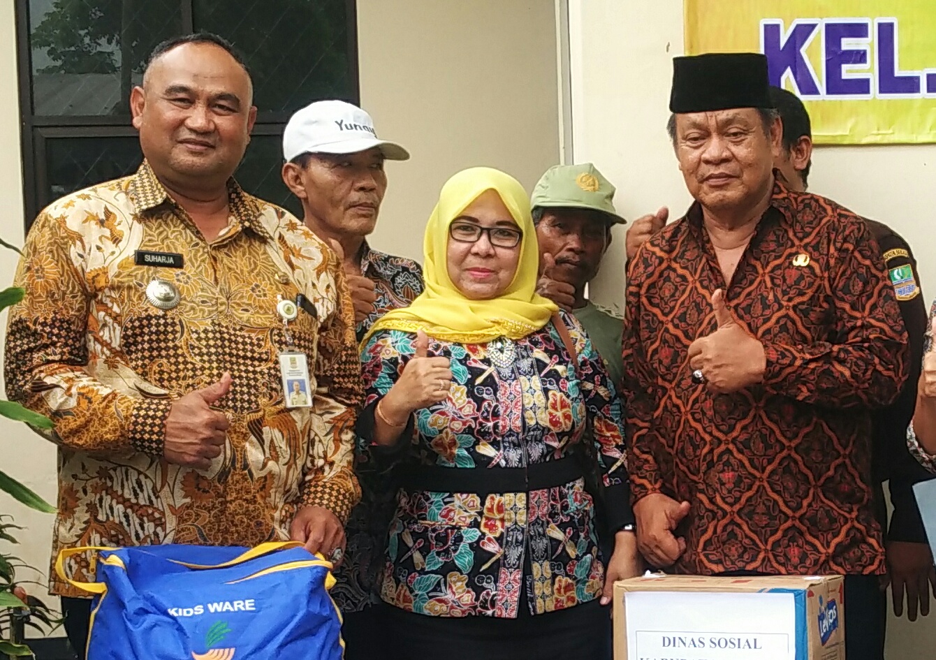 Penyerahan bantuan dari Dinsos Kab. Bekasi melalui Lurah Bahagia, Amin Mustofa yang didampingi Camat Babelan, Suharja