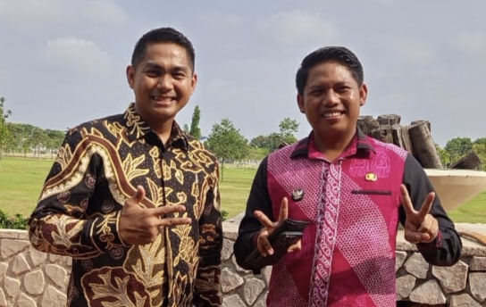 Foto, Sandra Erawanto dari Kemensesneg menggunakan pakaian Batik Coklat, Koirul Anwar mengunakan pakaian batik corak warna merah