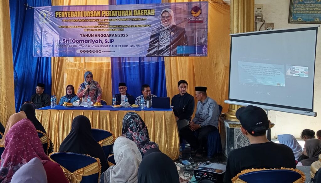 TEROBOSHUKUM.CO.ID – KABUPATEN BEKASI. Di kediaman H Tawih kampung Babakan di Desa Muara Bakti Kecamatan Babelan. Anggota Dewan Perwakilan Rakyat Daerah (DPRD) Provinsi Jawa Barat dapil lX dari Partai Nasdem, Hj. Siti Qomariah menggelar sosialisasi perubahan Peraturan daerah (perda) Propinsi No. 7 Tahun 2013 tentang Penyelenggaraan, Penghormatan, Perlindungan dan Pemenuhan Hak Penyandang Disabilitas. senin (25/8/25)