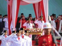 UPACARA DETIK-DETIK PROKLAMASI : Bupati Bekasi Ade Kuswara Kunang bertindak sebagai Inspektur Upacara Pengibaran Bendera Merah Putih pada peringatan HUT ke-80 Republik Indonesia tingkat Kabupaten Bekasi, yang digelar