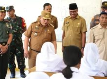 PJ Bupati Bekasi Dedy Supriyadi bersama Dandim 0509/Kabupaten Bekasi Letkol Inf Danang Waluyo berdialog dengan para siswa SMAN 1 Pebayuran dalam Peluncuran Program Makan Bergizi Gratis, sekaligus