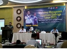 Kepala Bidang Pembudayaan Olahraga, Disbudpora Kabupaten Bekasi, Yudi Candra Permana, saat memberikan sambutan pada workshop manajemen olahraga tahun 2023 di Hotel Ibis Cikarang, Kamis (16/2/2023). TEROBOSHUKUM.CO.ID –