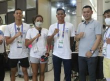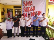 SUMBANG EMAS: Atlet Kabupaten Bekasi Aflah Fadlan Prawira saat disambangi tim Satuan Pelaksana (Satlak) Monitoring, Bang Rezha menggunakan kaos biru muda nomor dua dari kanan Ketua KONI Kabupaten
